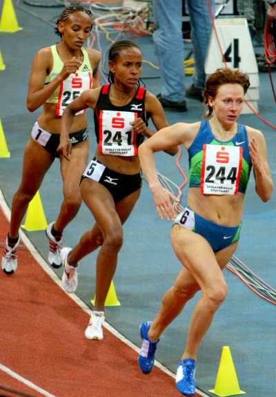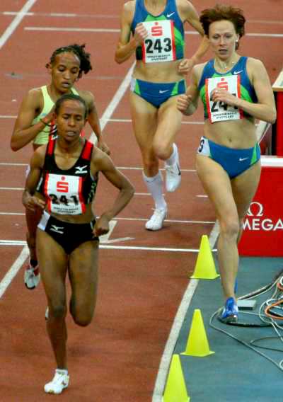 ![]() Häsin Teil 1: Die zuverlässige Russin Olga Komyagina macht der Äthiopierin Meseret Defar (241) zunächst bis 1800 Meter erfolgreich das Tempo auf Weltrekordkurs... (Foto, Copyright: Herbert Steffny)